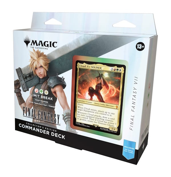 The Magic the Gathering: Final Fantasy – Limit Break Collector’s Edition Commander Deck is a Red-Green-White deck of 100 Surge Foil cards, with a 2-card Collector Booster Sample Pack, 10 double-sided token cards, and 1 deck box